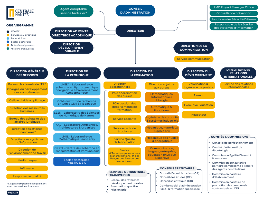 Centrale Nantes est partie intégrante de l'établissement Nantes Université qui a vu le jour le 1er janvier 2022 et participe à sa gouvernance à travers le conseil d'administration, le conseil académique et le directoire.